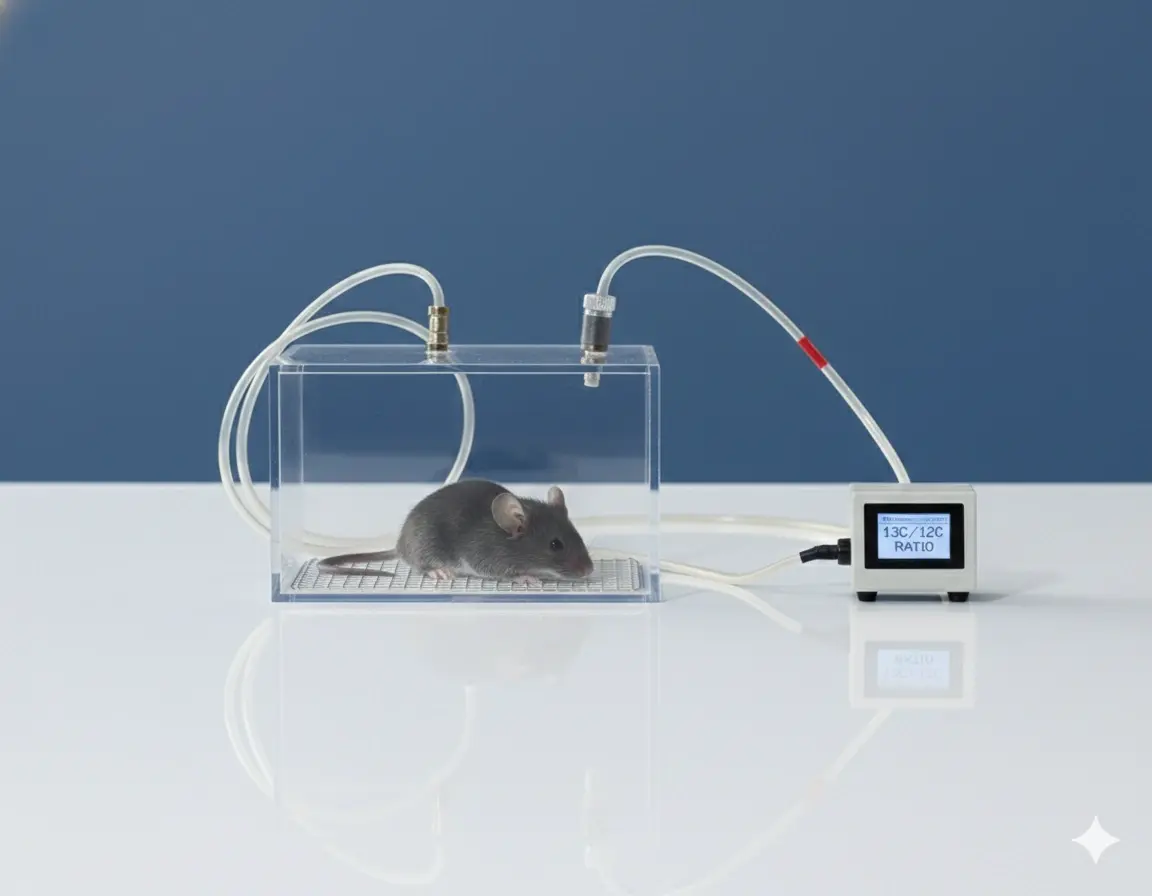 In metabolic research, one key goal is to determine how efficiently a substrate is oxidized to carbon dioxide (CO₂). Traditionally, this is achieved by administering a carbon-13 (¹³C)–labeled compound and measuring the appearance of ¹³CO₂ in expired breath over time.